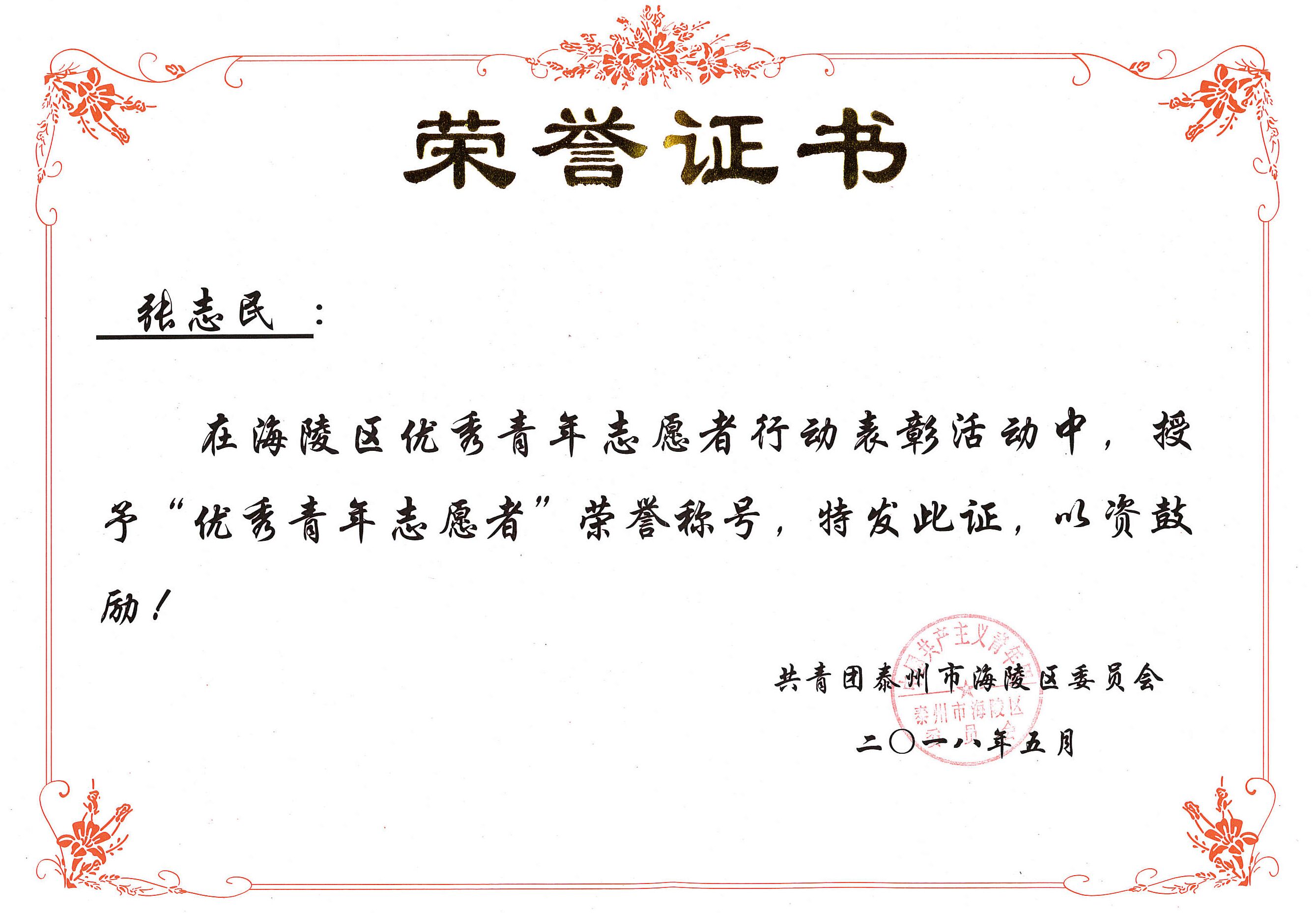 2018年5月,張志民在海陵區(qū)優(yōu)秀青年志愿者行動(dòng)中,授予“優(yōu)秀青年志愿者”榮譽(yù)稱號(hào)。