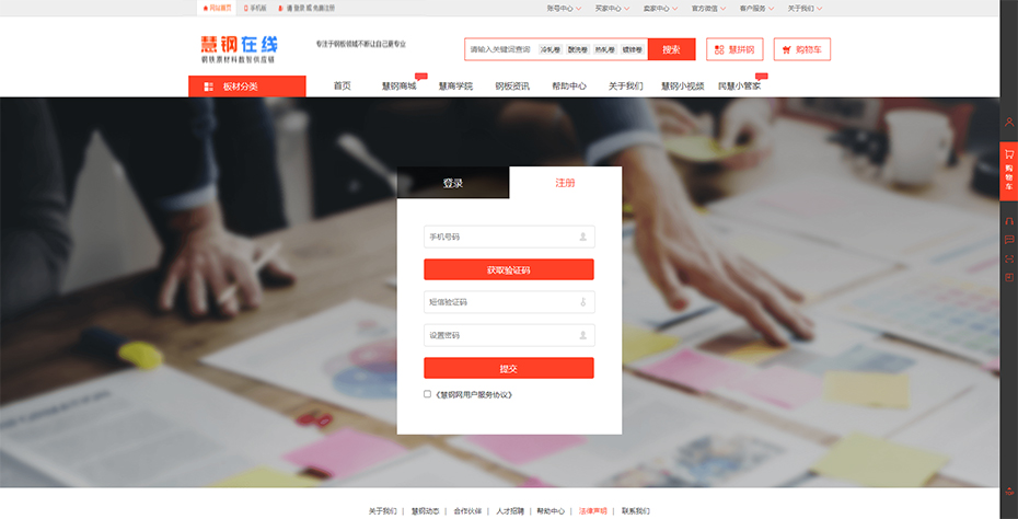(1)訪問(wèn)慧鋼在線首頁(yè)www huisteel com(2)點(diǎn)擊網(wǎng)站左上角免費(fèi)注冊(cè)(3)輸入想要注冊(cè)的手機(jī)號(hào)和驗(yàn)證碼,點(diǎn)擊獲取短信驗(yàn)證碼,隨后回收到