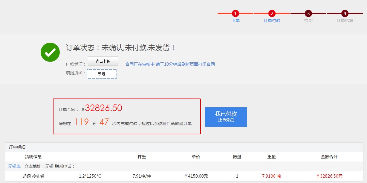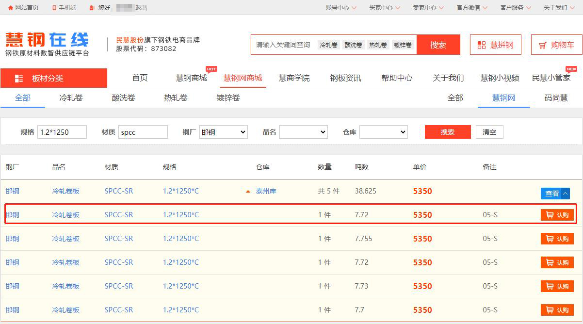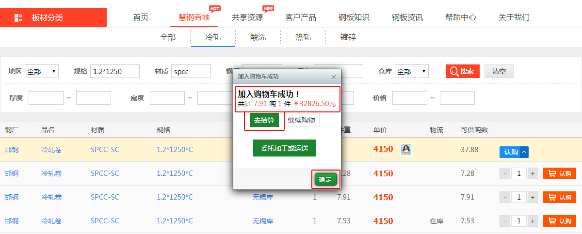 (6)找到所需產(chǎn)品之后點(diǎn)擊“認(rèn)購”,會(huì)出現(xiàn)不同卷重的冷軋卷,根據(jù)您想要的卷重在最右邊點(diǎn)擊“認(rèn)購”,(如7.72噸)。