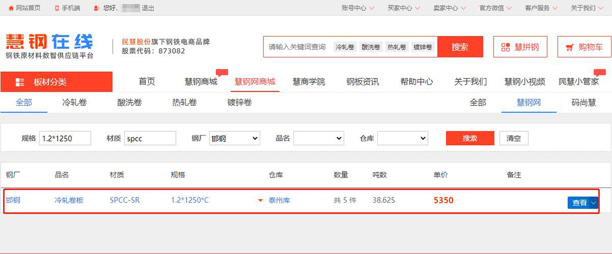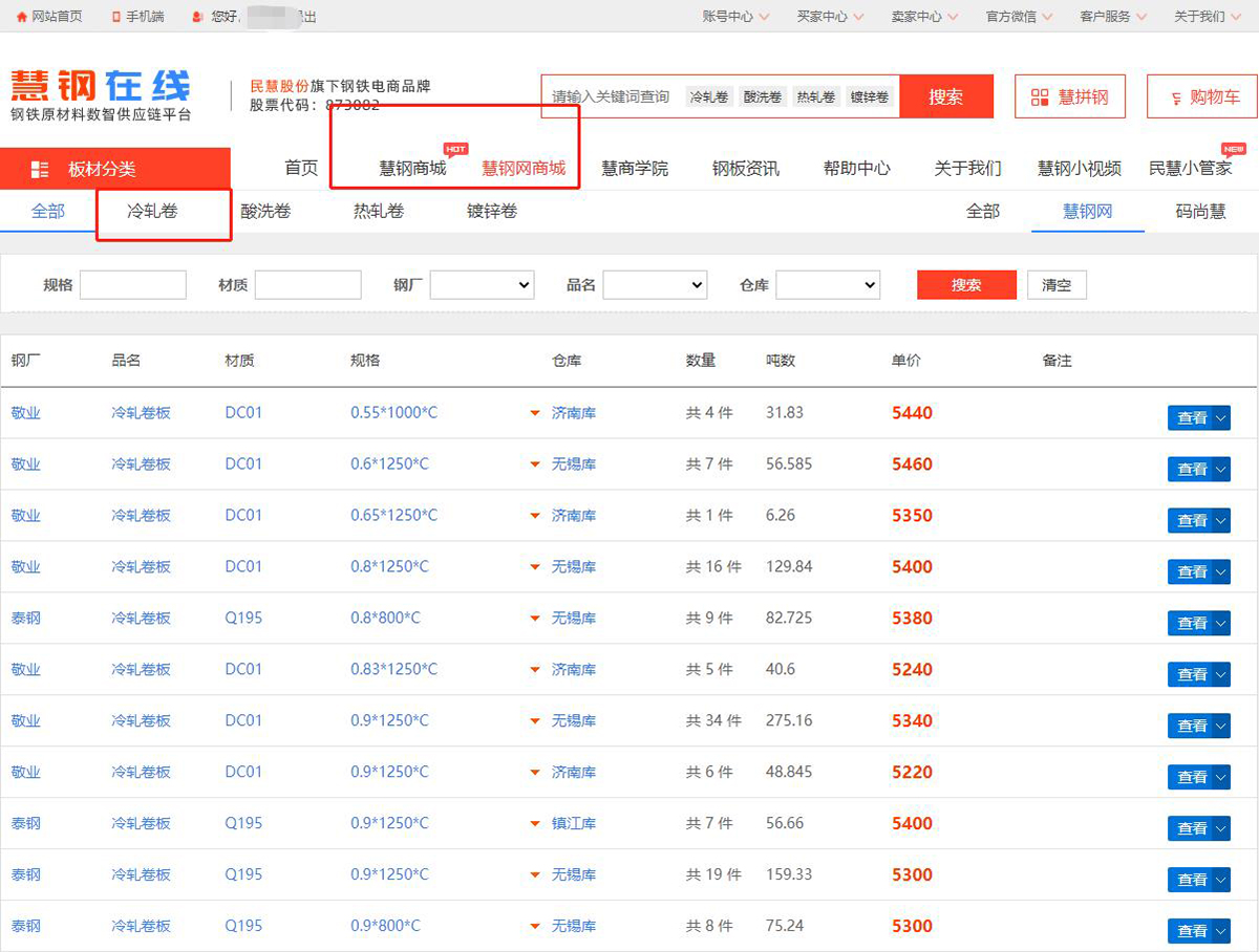 (4)點(diǎn)擊“慧鋼商城”可瀏覽各類產(chǎn)品,如果您想購買冷軋卷,即可點(diǎn)擊“慧鋼商城”下面的“冷軋”類,即可看到冷軋卷,隨后可根據(jù)所需規(guī)格挑選您想購買的冷軋卷。