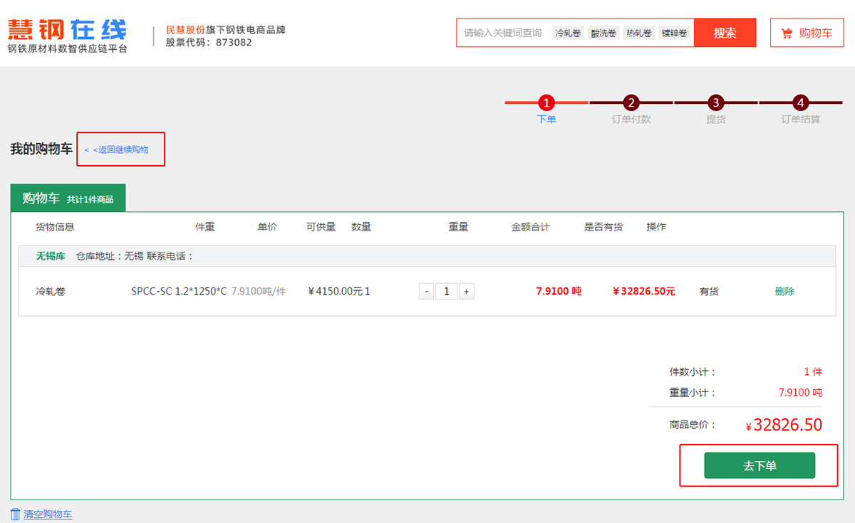 (8)此時(shí)會(huì)跳轉(zhuǎn)購物車頁面,再次核對(duì)所需購買的產(chǎn)品之后點(diǎn)擊“去下單”。若想繼續(xù)購物則點(diǎn)擊“返回繼續(xù)購物”重復(fù)步驟(4)(5)(6)(7)。