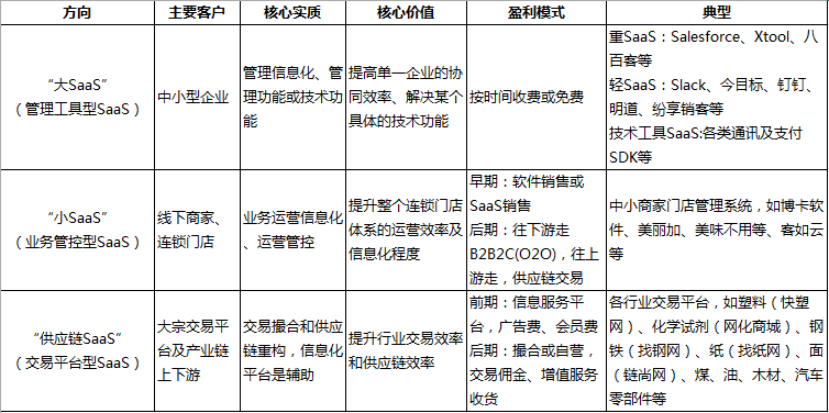 關(guān)于SaaS領(lǐng)域的分類,通??梢园凑?ldquo;通用-垂直”、“技術(shù)-管理-業(yè)務(wù)”等維度進(jìn)行劃分?;趹?yīng)用場(chǎng)景以及盈利模式這一維度,可以將SaaS細(xì)分為三個(gè)方向:“大SaaS”、 “小SaaS”以及“供應(yīng)鏈SaaS”,如下表。